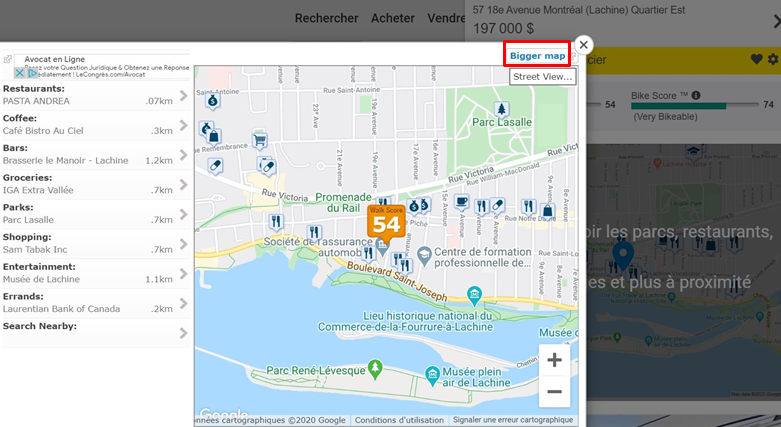 2. En cliquant sur la carte, vous pourrez visualiser les commerces et services environnants. Si vous souhaitez avoir plus d'informations sur l'environnement du bien immobilier, cliquez sur "Bigger map", vous serez alors redirigé sur la page dédiée au walkscore de la propriété.