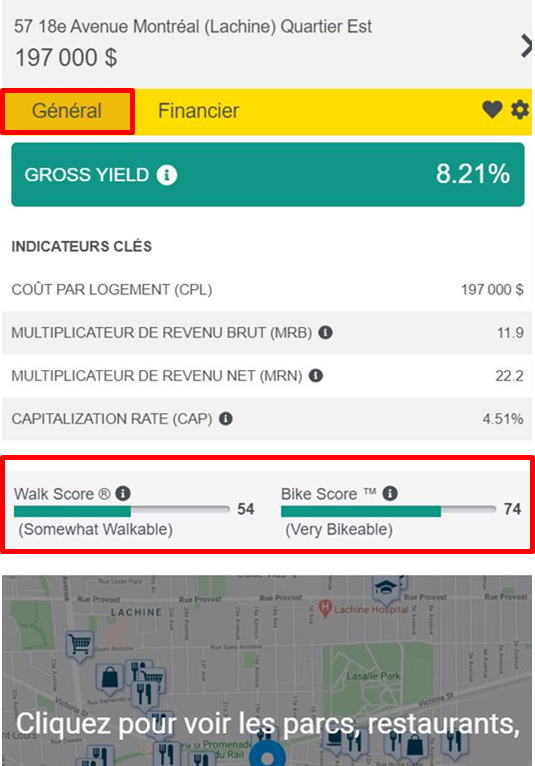 3. Pour visualiser le type de services à proximité du bien immobilier, cliquez sur les 2 vignettes bleues -Walk score - Bike score