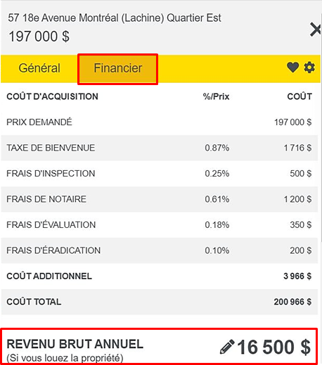 - Retrouver les revenus brut moyen des propriétés de votre région dans la rubrique « Financier »