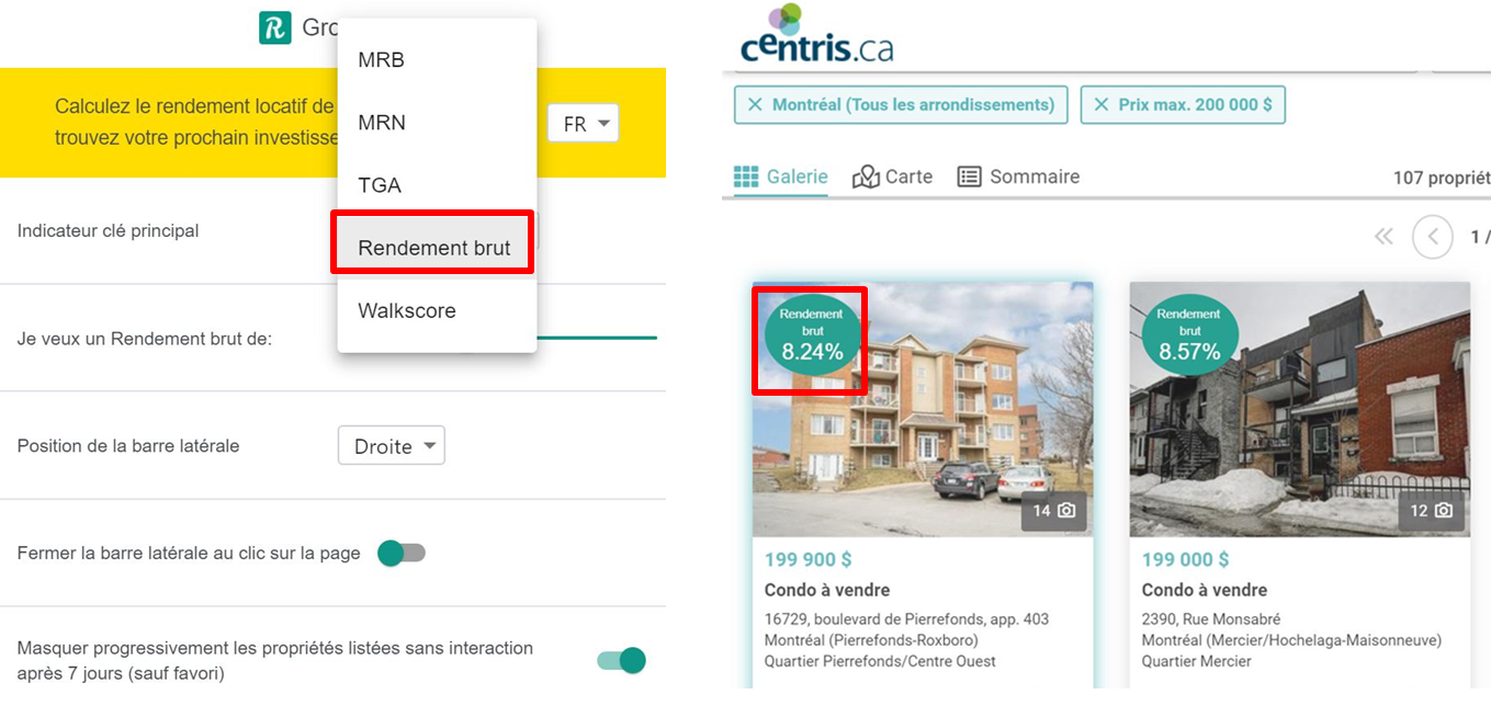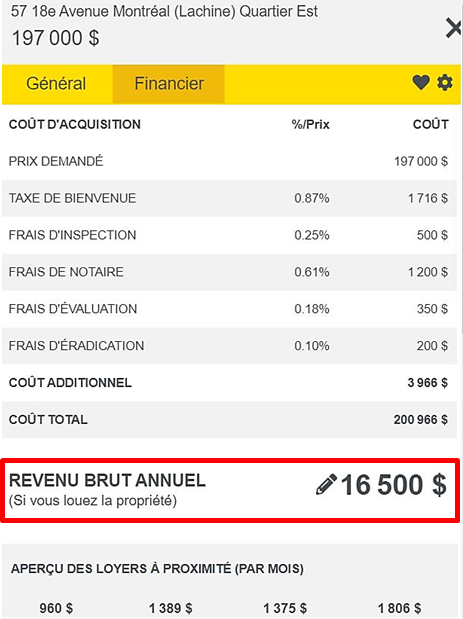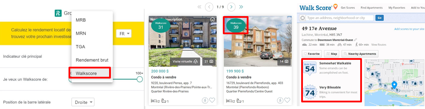 Avec Grossyield, vous pourrez visualiser le walkscore et le taux de rendement de votre futur bien.